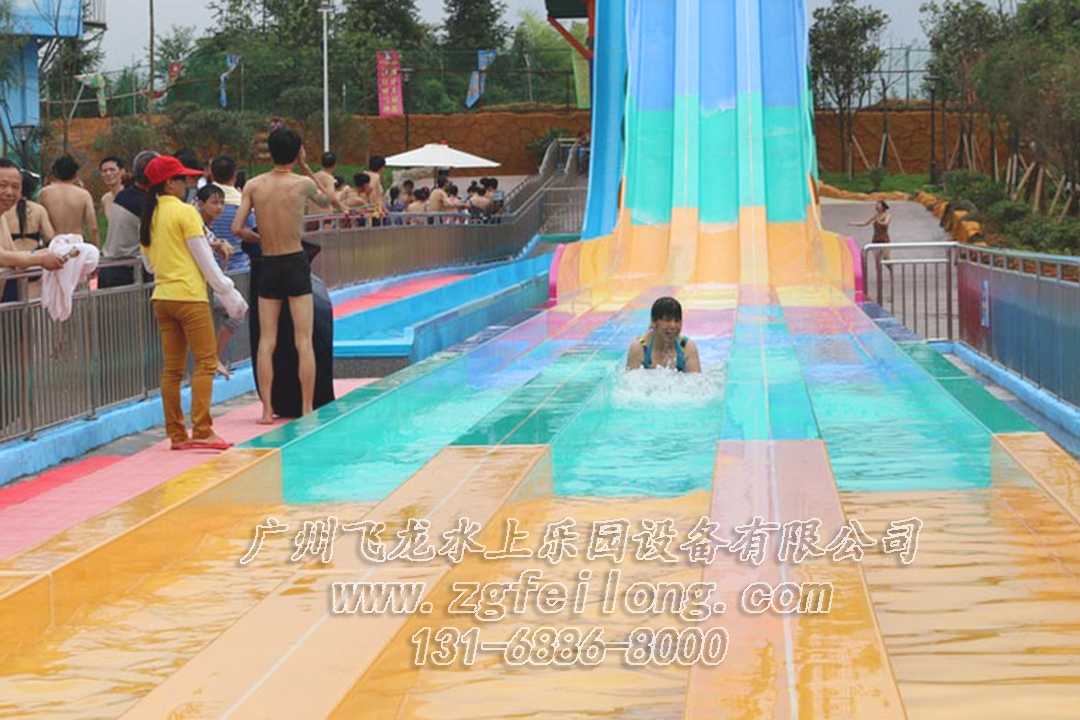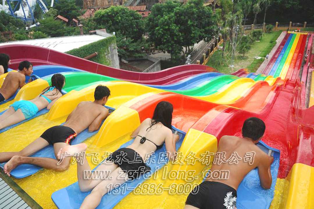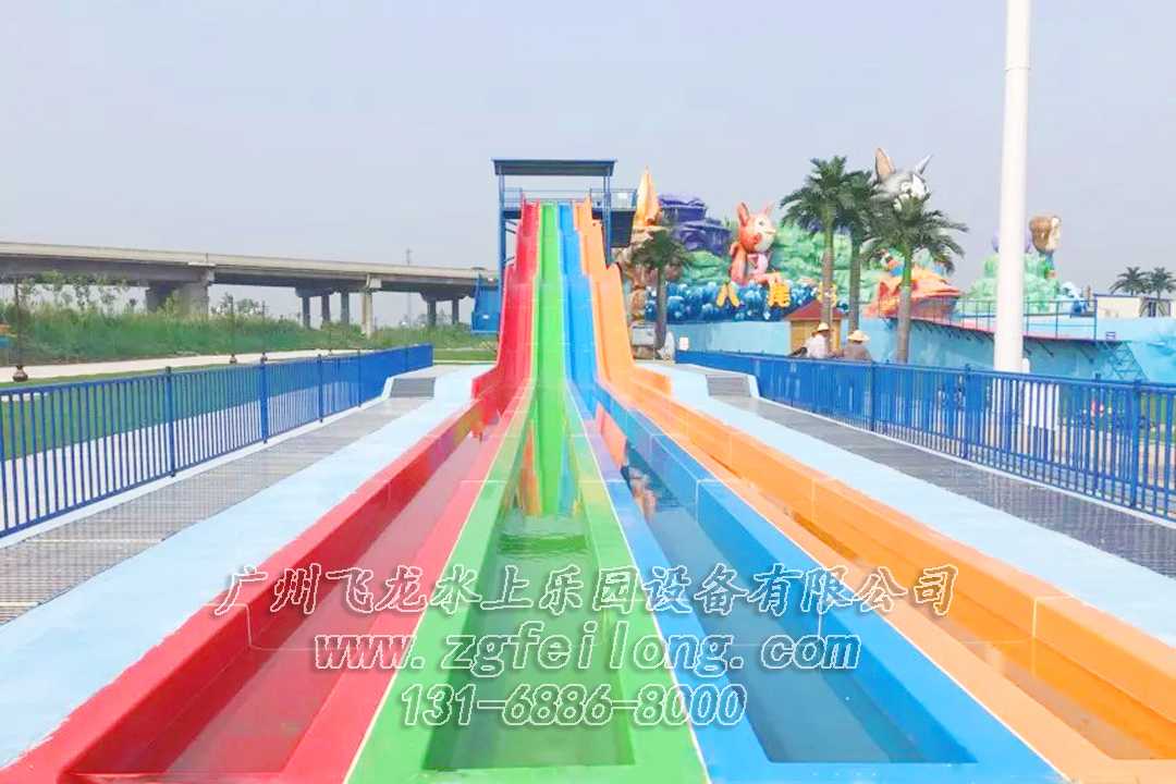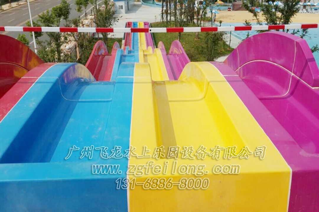 彩虹競賽滑梯是一款相當(dāng)經(jīng)典的水上樂園水滑梯設(shè)施,可以進行多道設(shè)計,一般為3-10道,可以有身體滑行,也可以乘浮墊滑行。參與者可以各占一道同時出發(fā)進行比賽,尖叫聲將伴隨滑行的始終,一個個沖向終點,在滑行的過程中體驗運動休閑與競賽的樂趣。該滑梯的互動性非常強,同時具有很強的游客接待能力,讓游客可以多次參與到比賽中,獲取歡樂和暢快的獨特體驗。滑梯高度可以從幾米到幾十米都可以設(shè)計,顏色也可自由搭配。